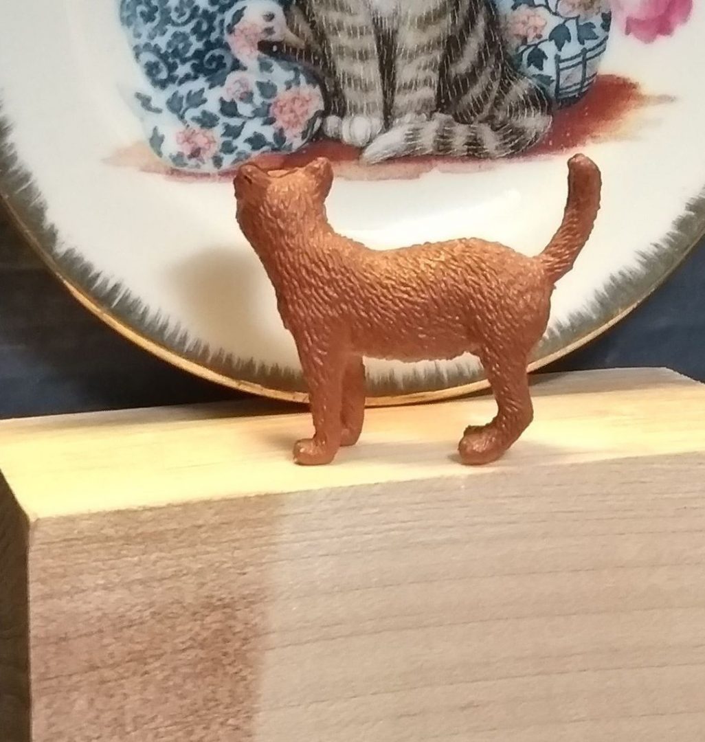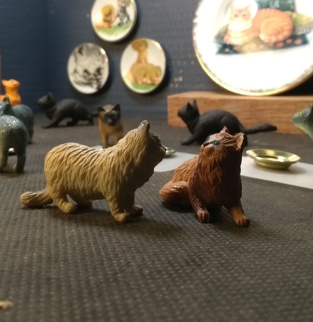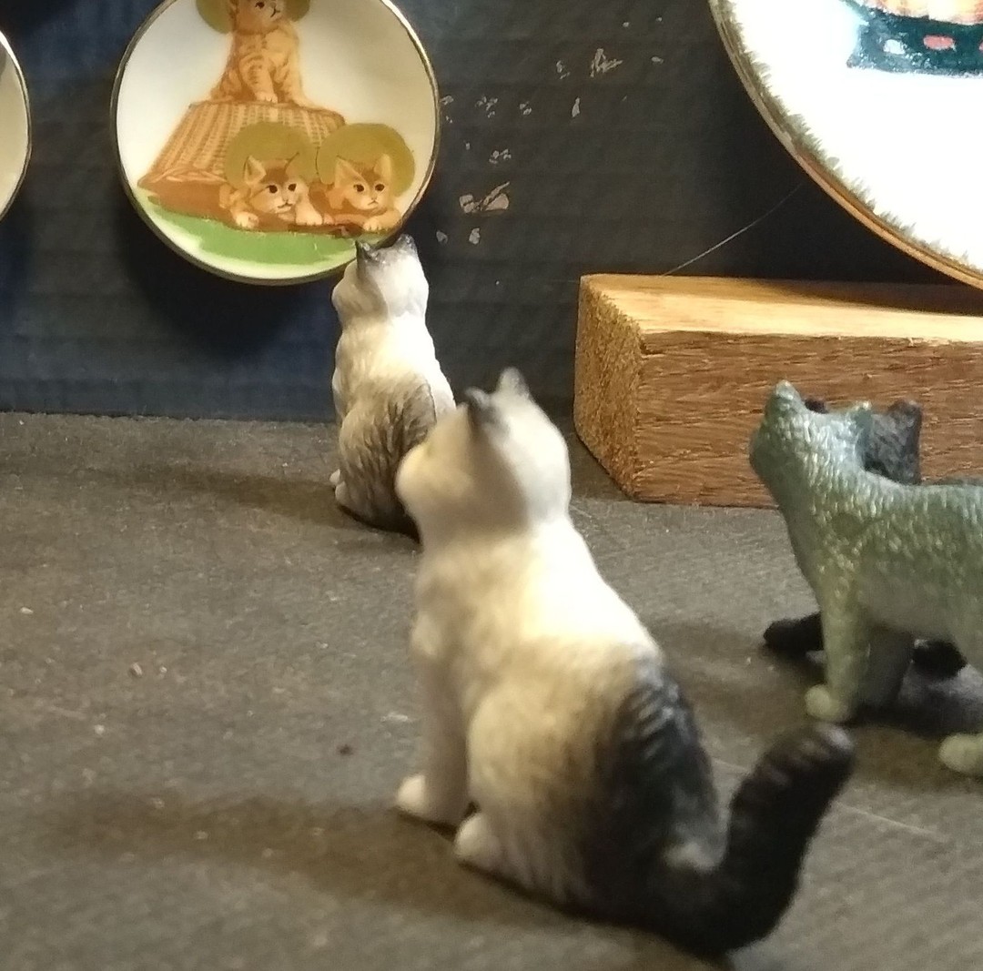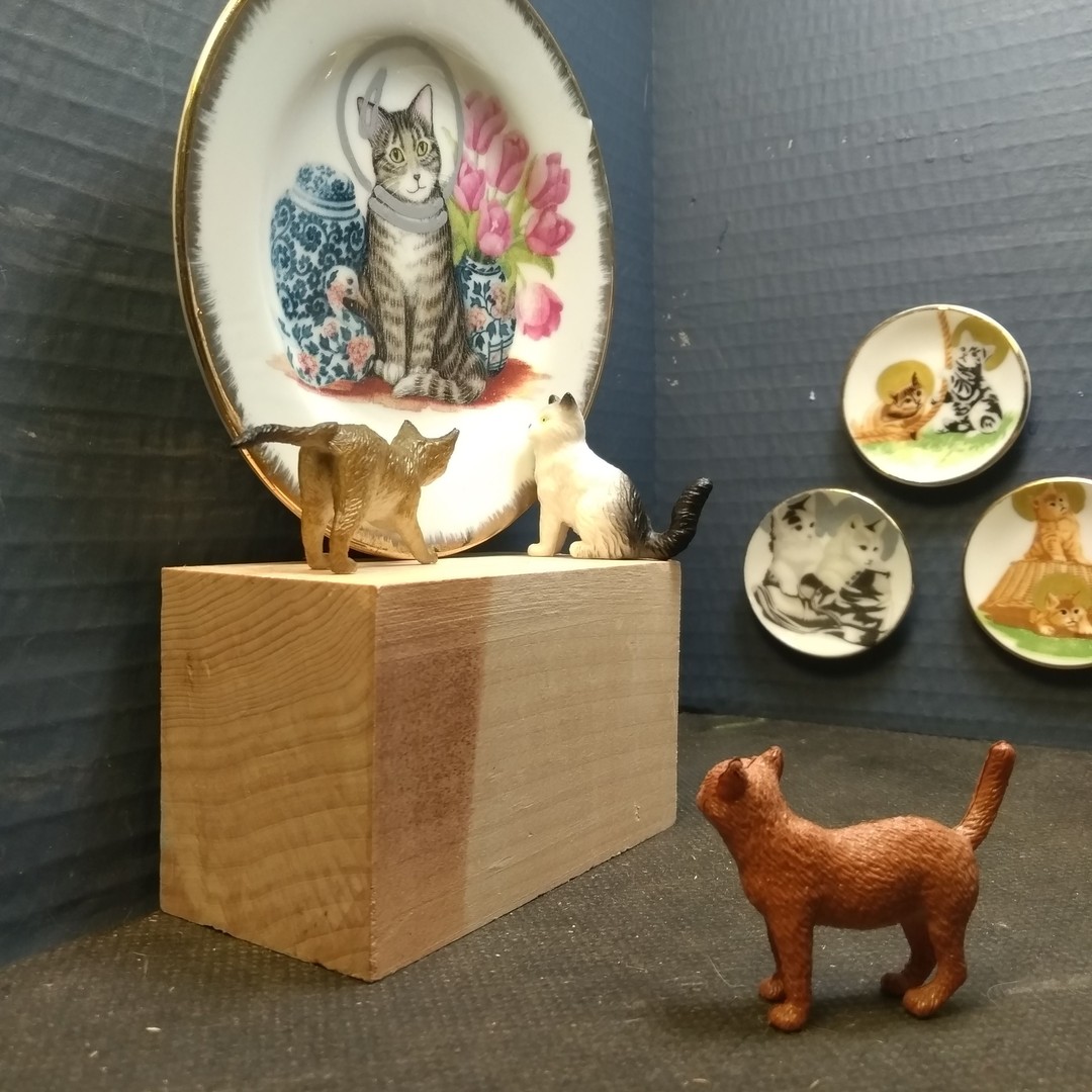 Amy said “The project is inspired by my fascination with animal histories, sci-fi and my complicated relationship to my catholic heritage. Play and scale are key elements of the work I make. The plates haven’t previously been displayed. When I came across your Tiny Gallery open call I was very excited by the idea of my mini plates being displayed in relation to your plastic cat viewers. Within the context of your Tiny Gallery the small intimate plates will blur between large commemorative merchandise and religious icons.”