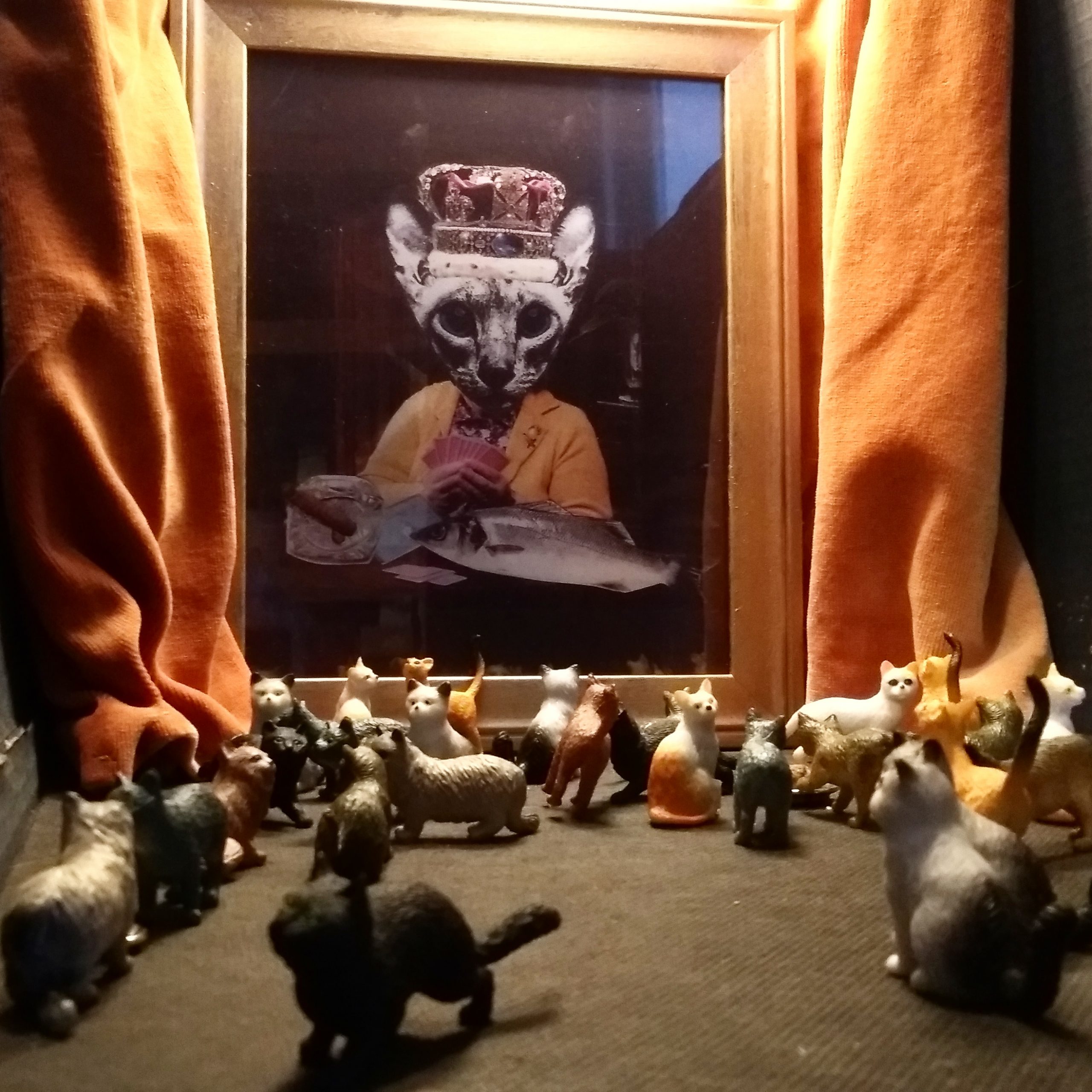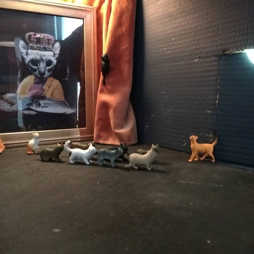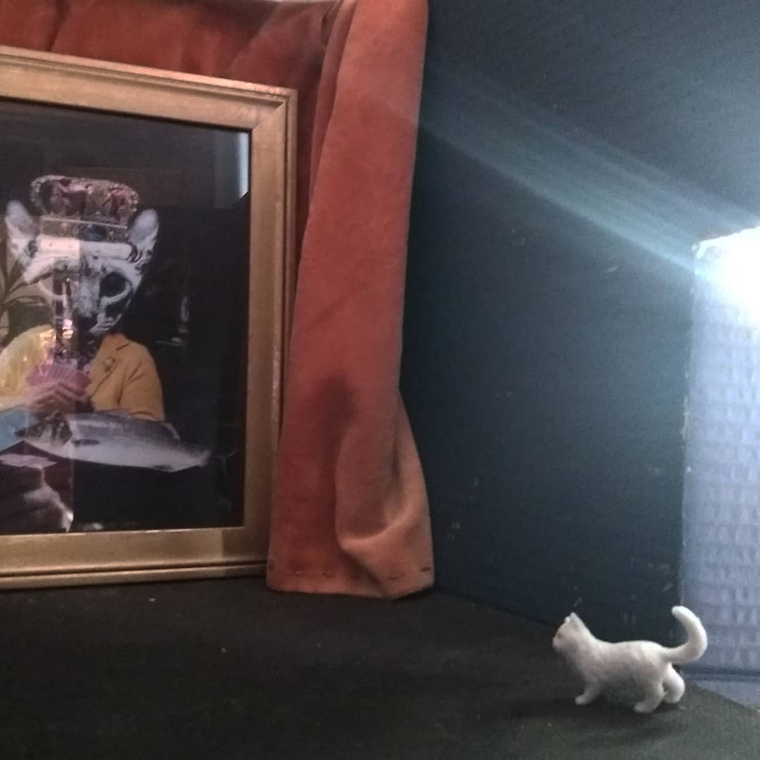 My Tiny Cat Gallery is a small cardboard box staffed and visited by tiny plastic cats. Curated by Lisa Cole each exhibition at the Tiny Cat Gallery encourages us to see artwork from a different perspective. In the gallery space A4 artworks are huge and domineering. For more information and details about submitting a proposal please check the Tiny Gallery FAQ.