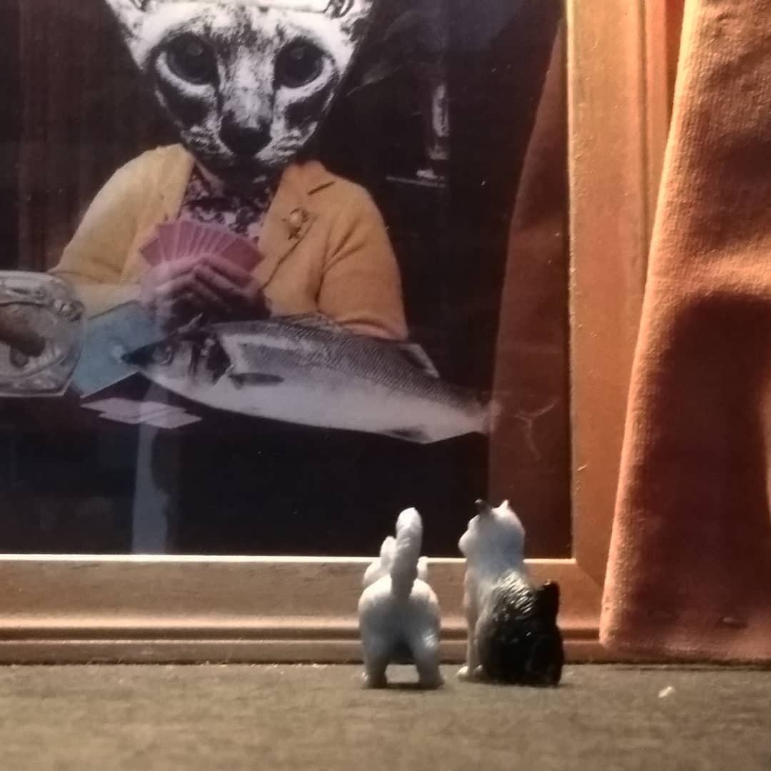 The piece was created as a response to the scale of the gallery and as an image that would attract the resident audience of cats. The subject is deliberately riffing upon a cat who plays poker for FISH !