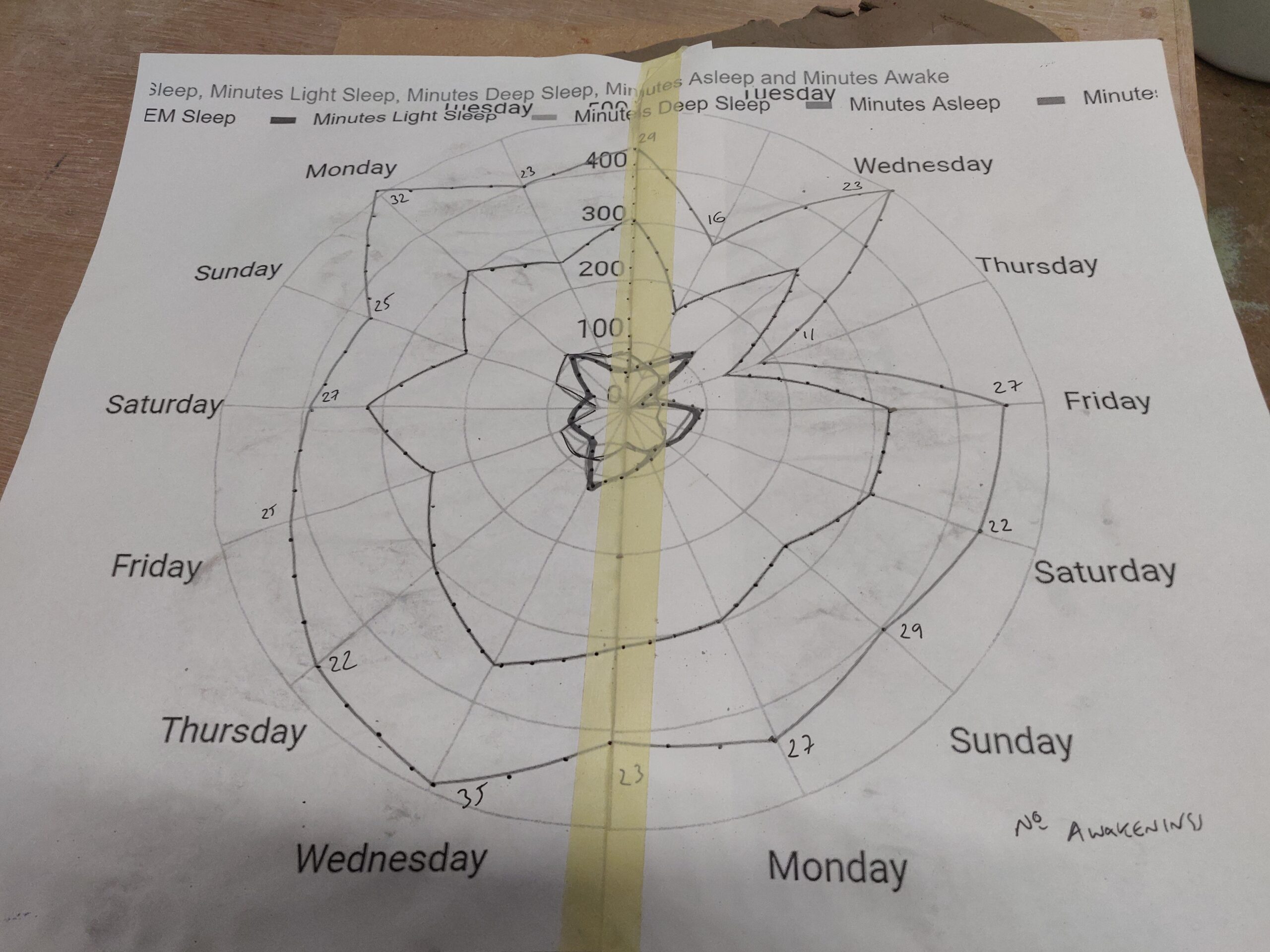 I have never been good at sleeping. I wake frequently through the night and struggle to get back to sleep. A fitness monitor tracked the minutes I spent in rapid eye movement, light and deep sleep. It also tracked total minutes awake and the number of times I woke up. Charted in radar form this data became the shape of my insomnia.