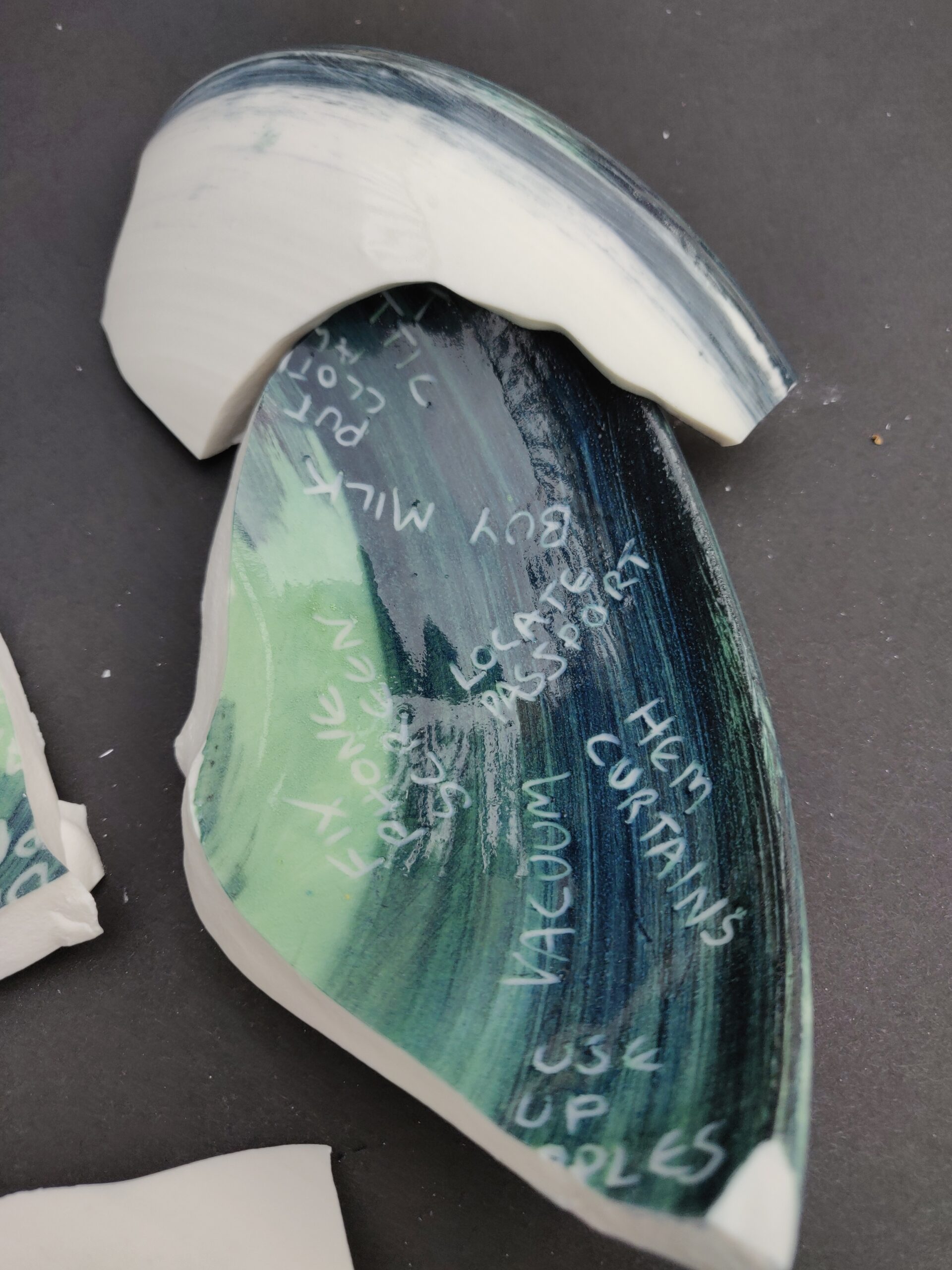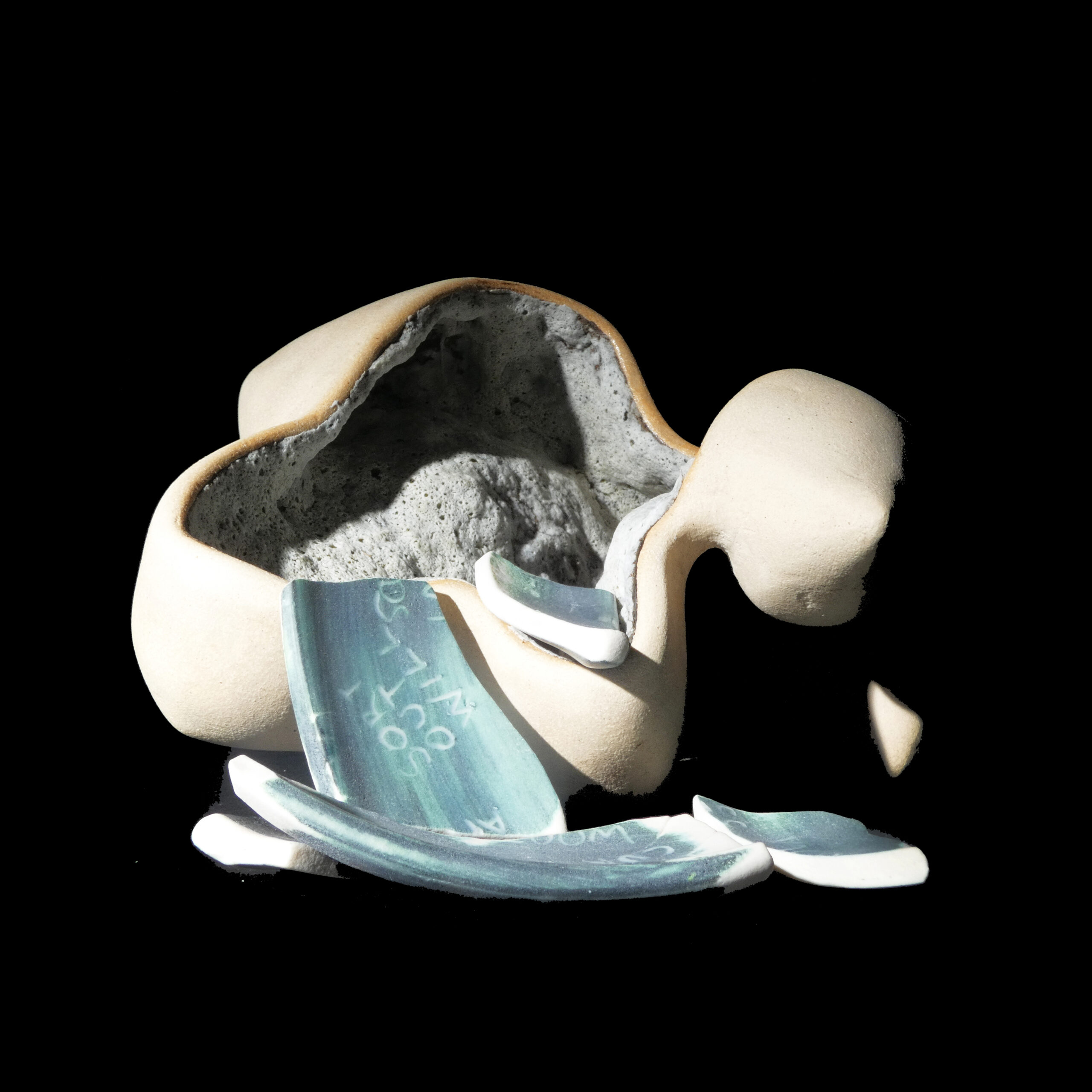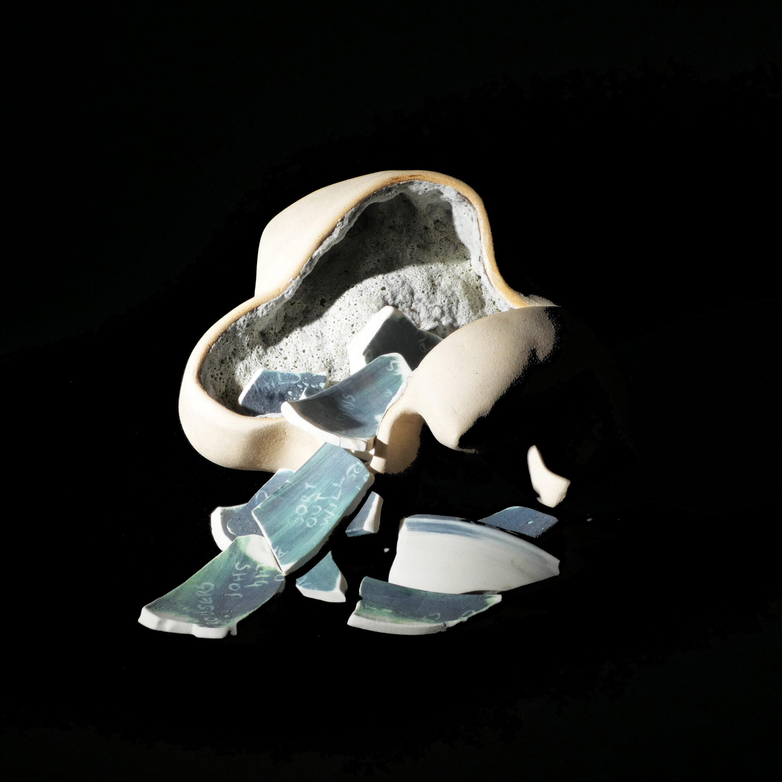 After breaking, the fragments of the smashed pot of plans are sand blasted to resemble sea glass, referencing water and symbolising a sharp mind rendered dull and exhausted.
