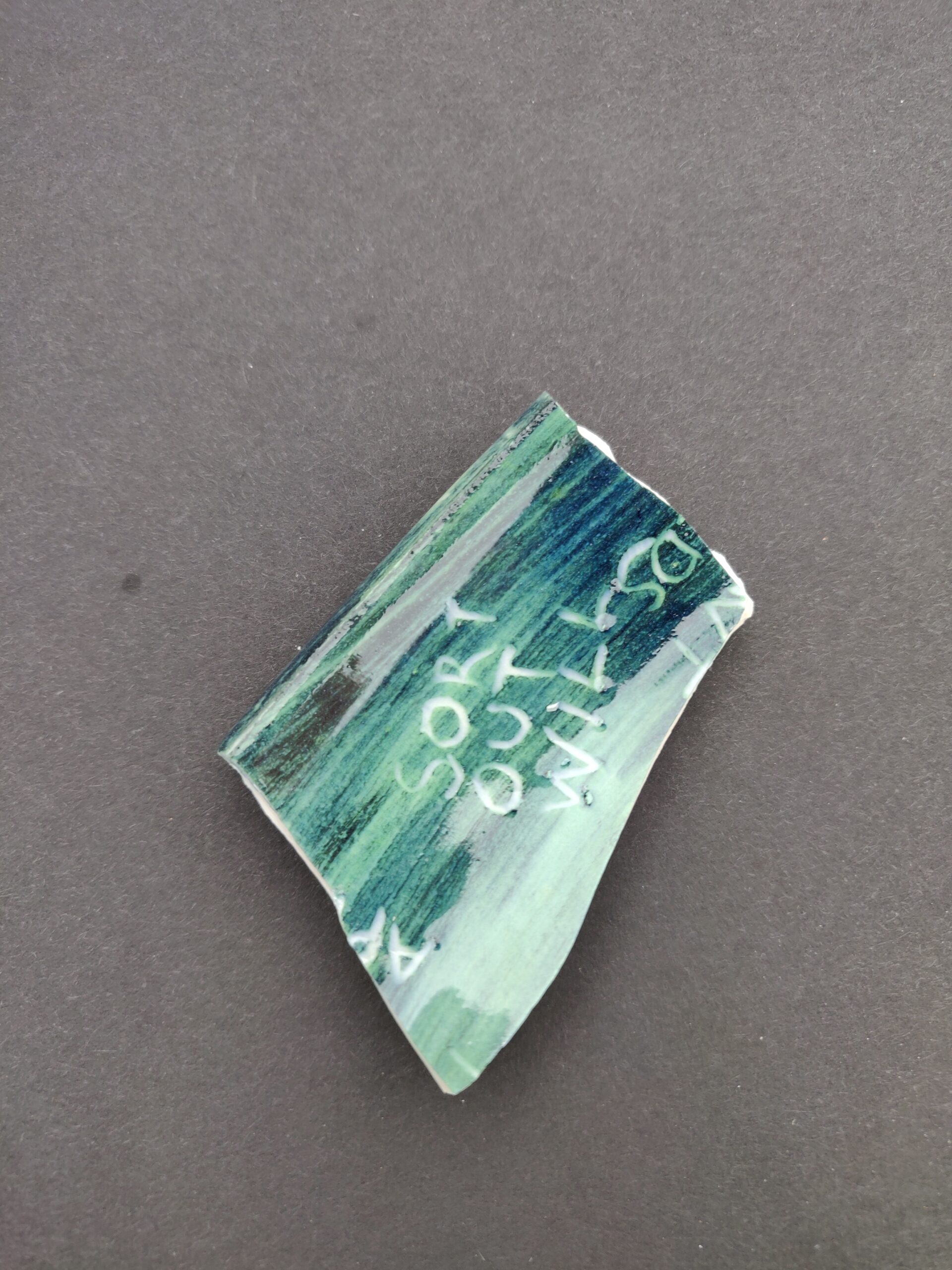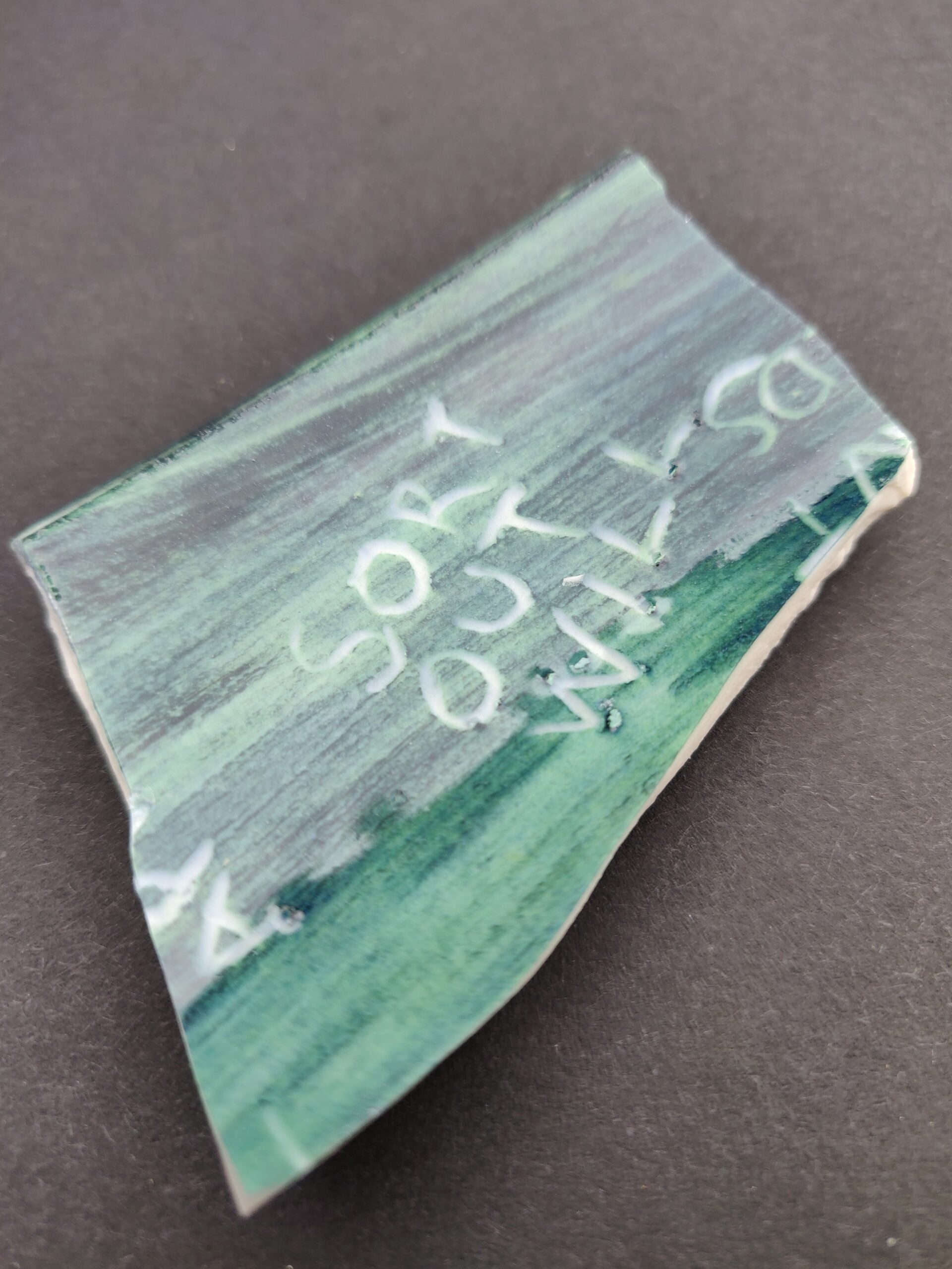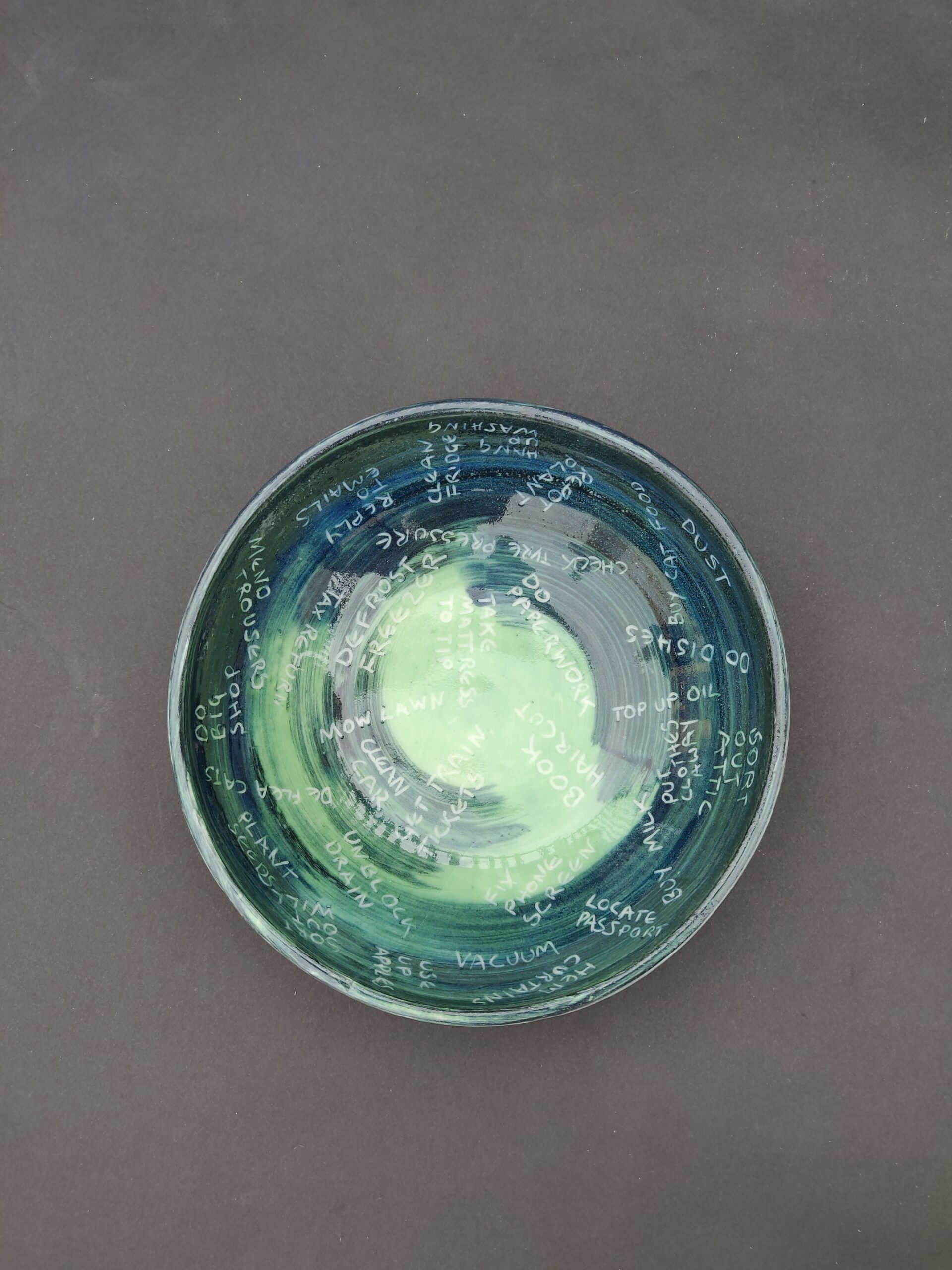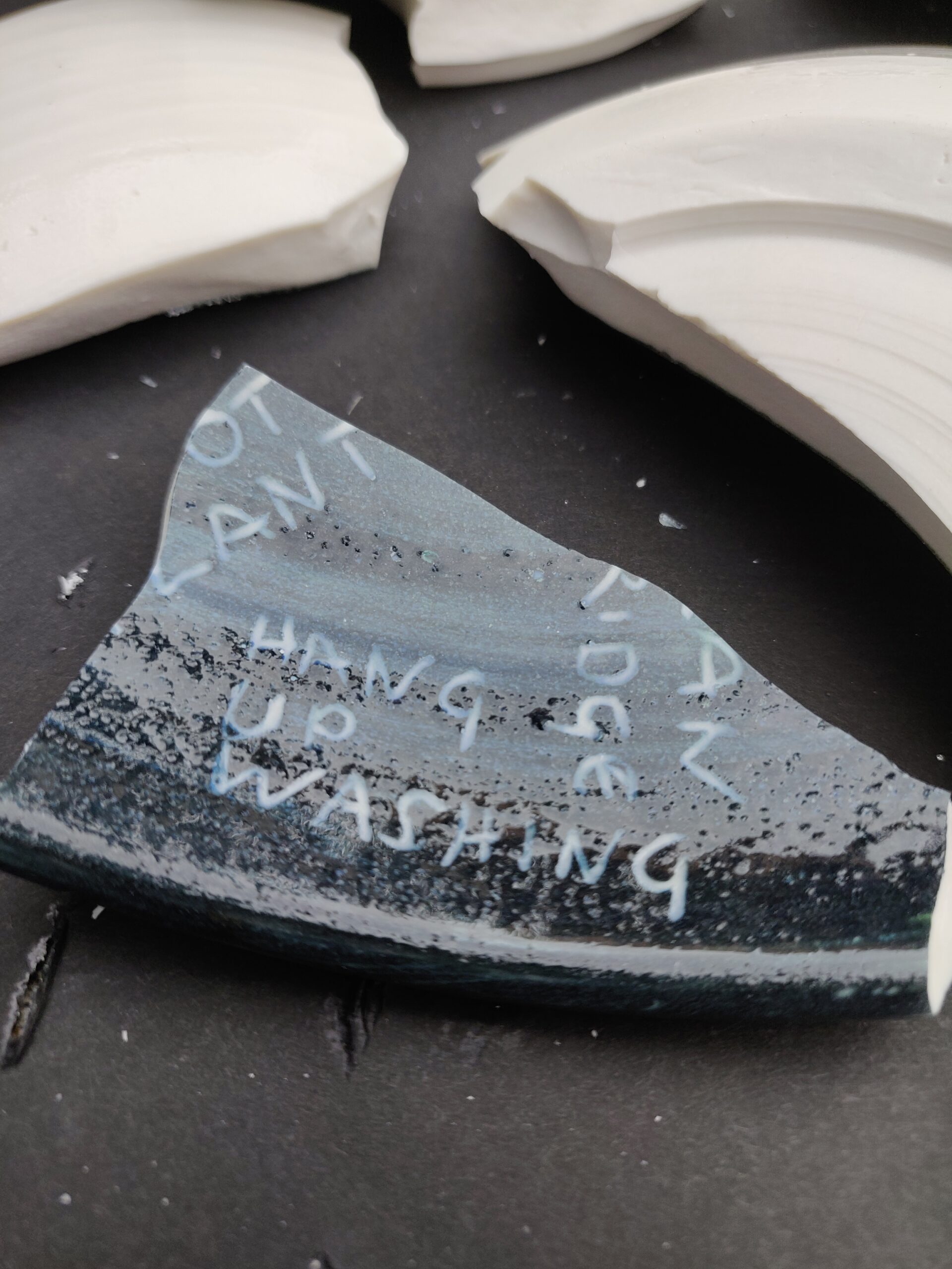 After breaking, the fragments of the smashed pot of plans are sand blasted to resemble sea glass, referencing water and symbolising a sharp mind rendered dull and exhausted.