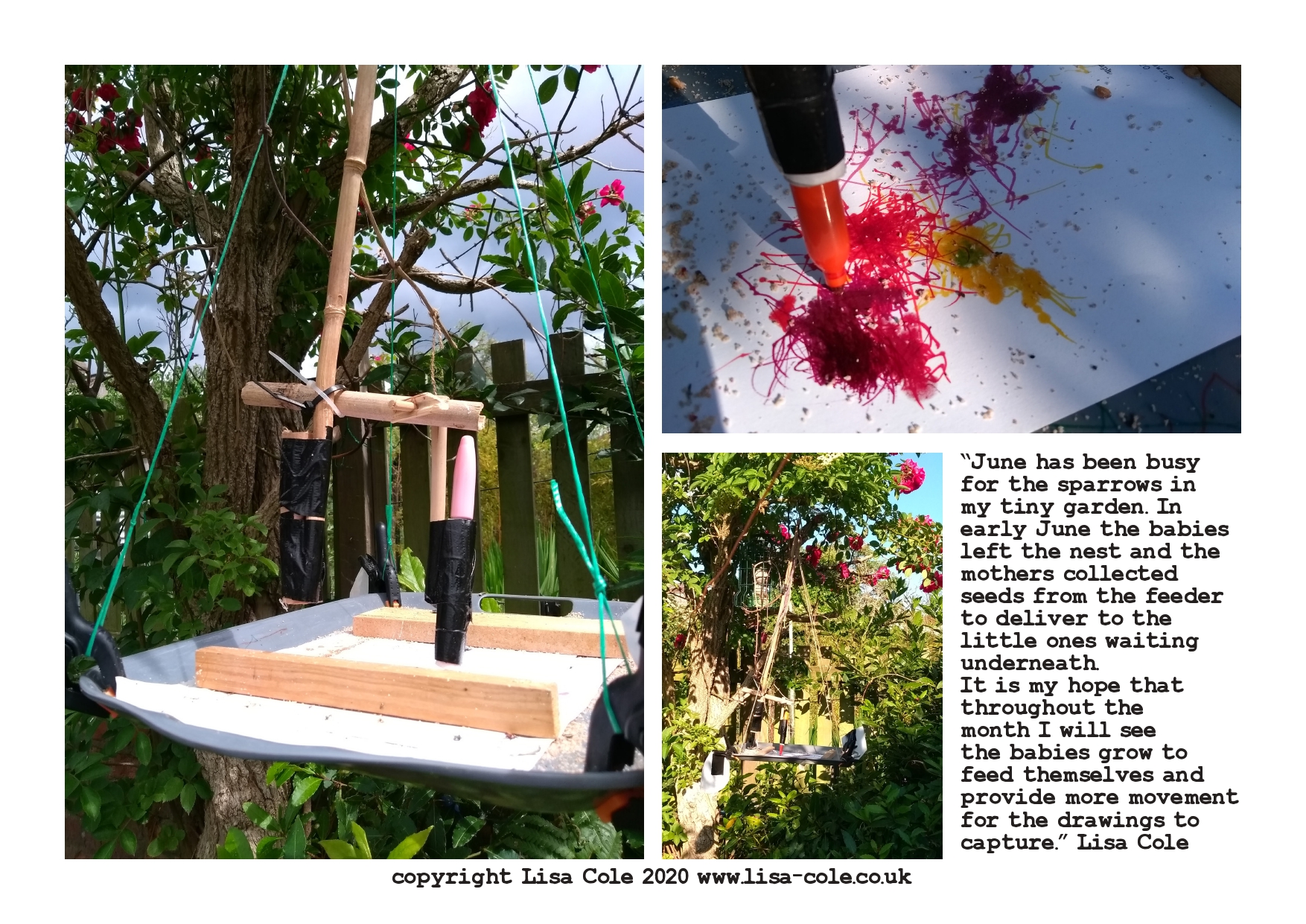 “June has been busy for the sparrows in my tiny garden. In early June the babies left the nest and the mothers collected seeds from the feeder to deliver to the little ones waiting underneath. It is my hope that throughout the month I will see the babies grow to feed themselves and provide more movement for the drawings to capture.”