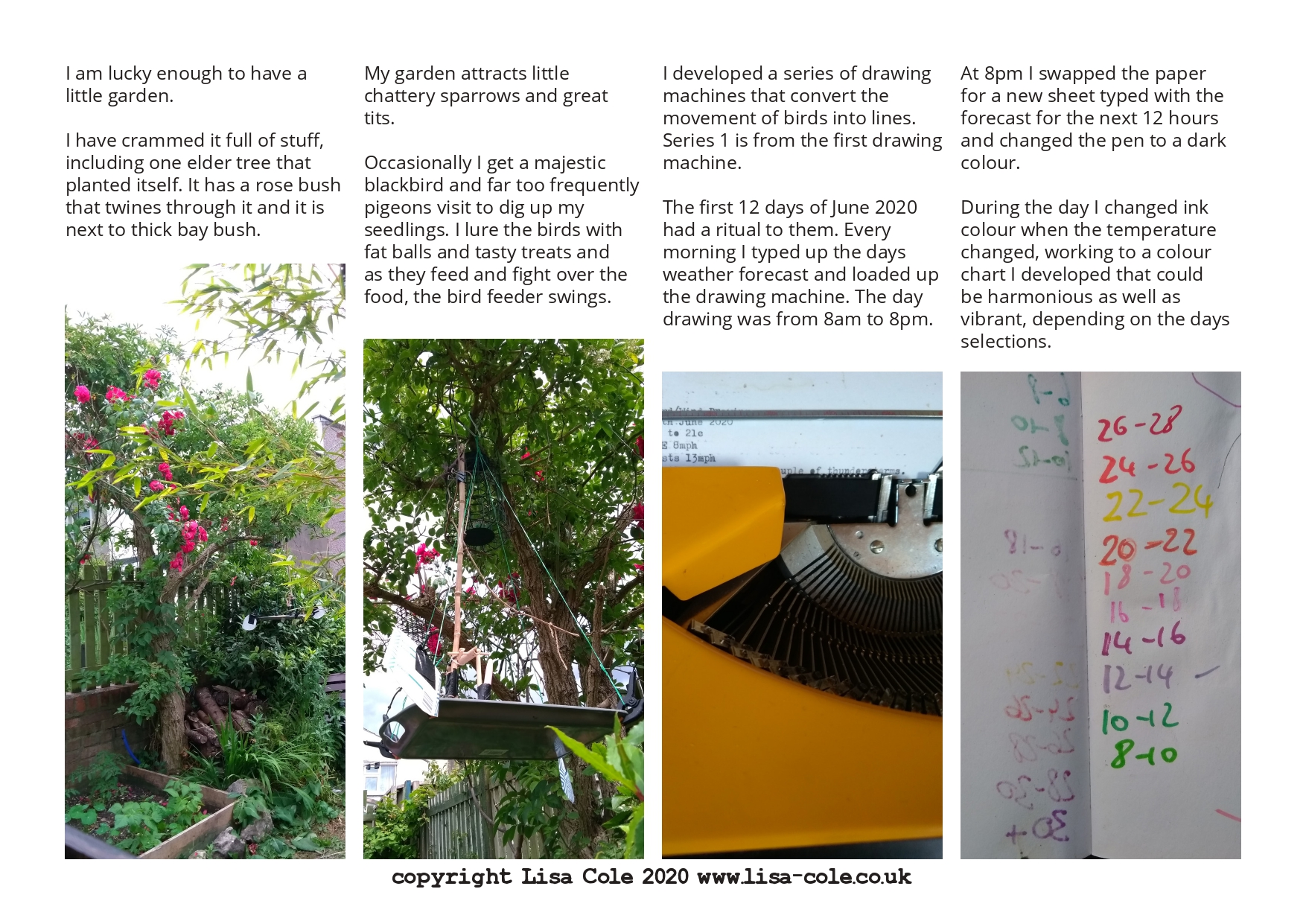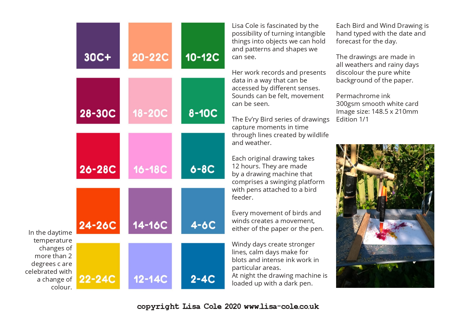 In the daytime temperature changes of more than 2 degrees centigrade are celebrated with a change of colour. Windy days create stronger lines, calm days make for blots and intense ink work in particular areas.