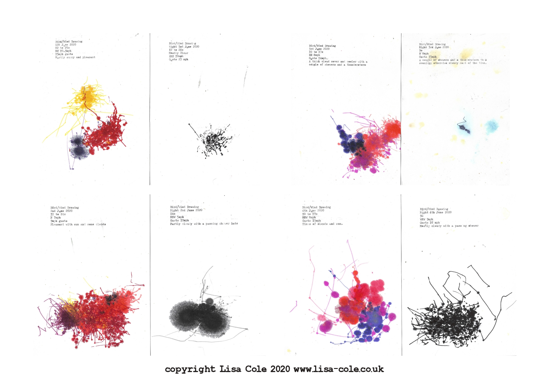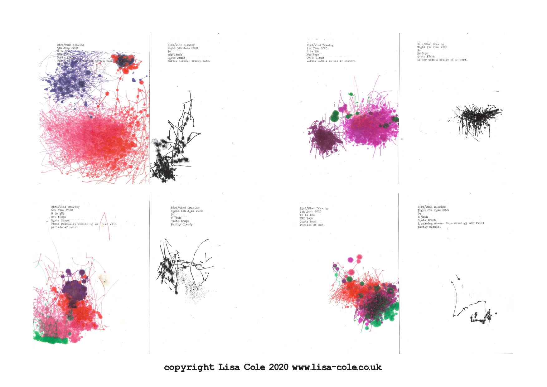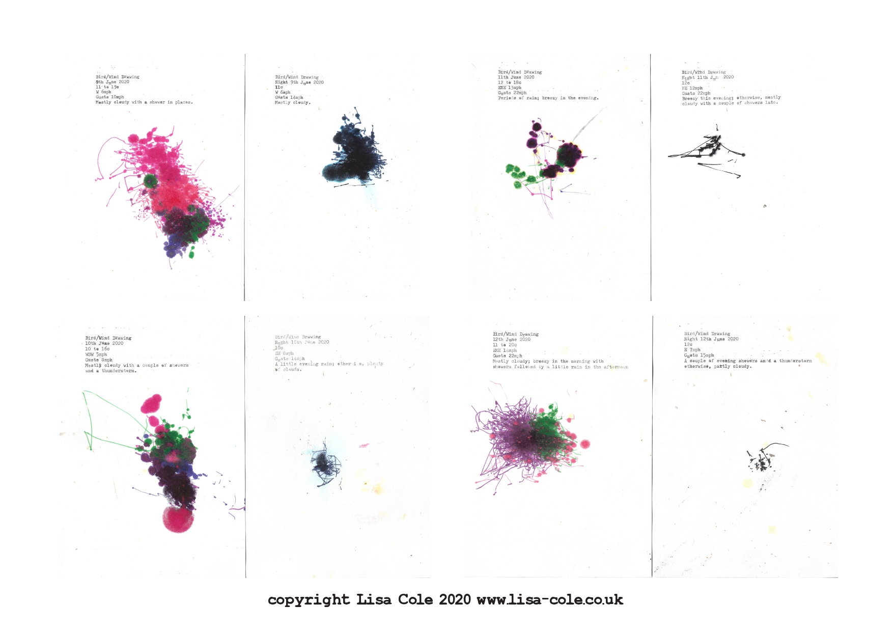 Each Bird and Wind Drawing is hand typed with the date and forecast for the day.