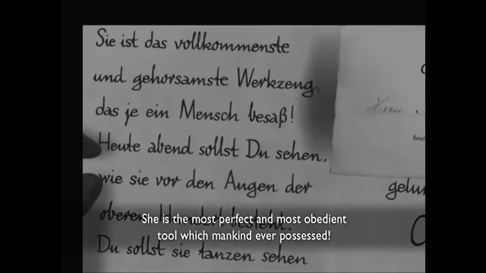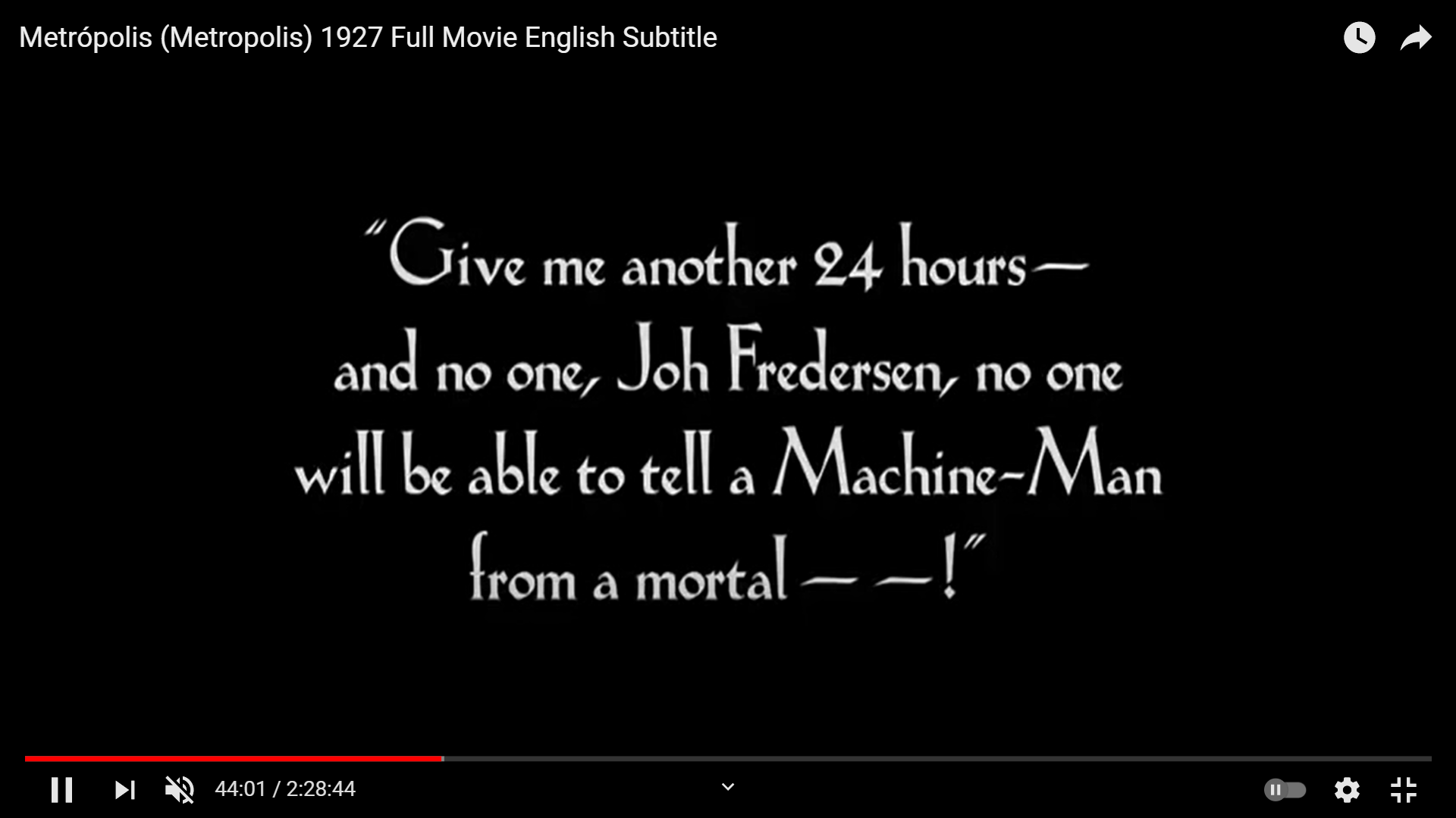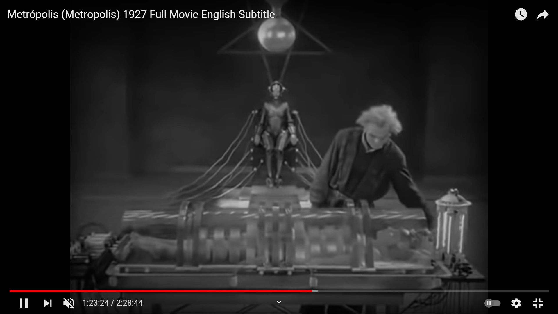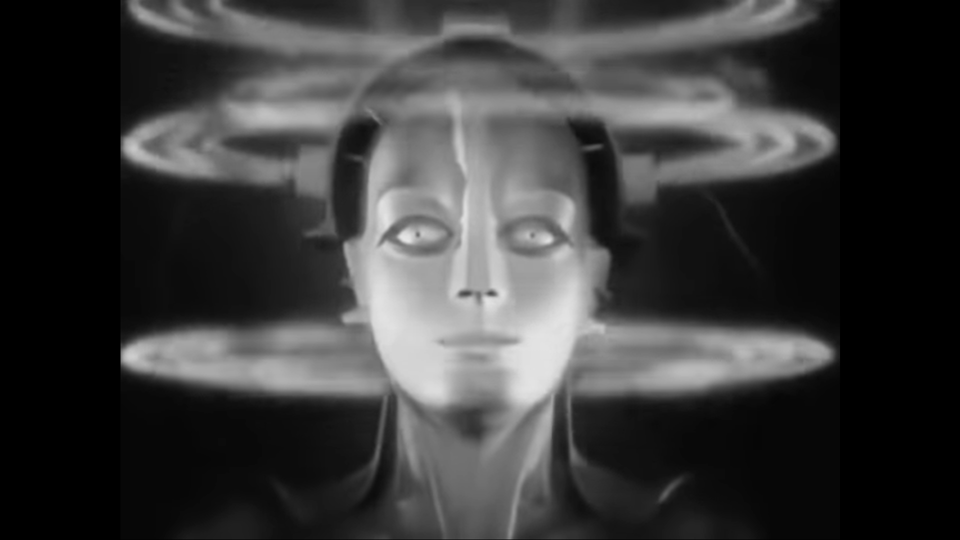 Machine-human (Maschinenmensch) built by Rotwang. Some versions have Rotwang instruction the robot to cause destruction, others suggest that Rotwang lost control of it. The scientist uses Maria’s body to create a clone over the top of the metallic robot. The robot doesn’t seem to inherit any of Maria’s good qualities, just the body. When the Maria robot is burnt towards the end of the film we see it revert to metalso the skin was just surface. Whether the robot went rogue or an error prevented it from becoming “the most perfect and obedient tool man ever possessed’ it important. If it wasn’t instructed to destroy, would it have been a good robot? Fritz Lang said in 1973 (see Omnibus link below) that he didn’t think technology would make us happier.